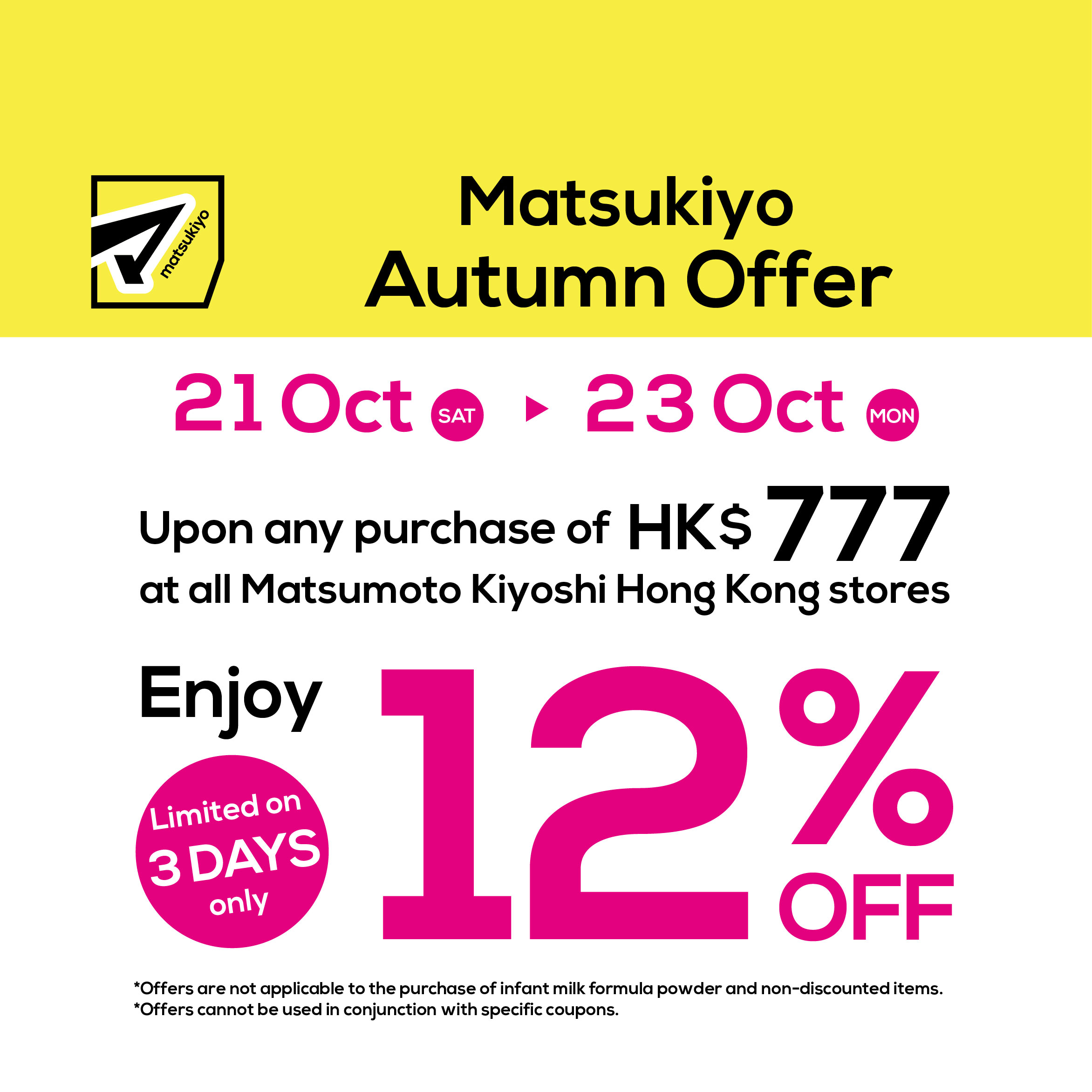 Matsukiyo Promotion from 21 Oct to 23 Oct 2023 at all Matsumoto Kiyoshi Hong Kong stores: Enjoy 12% off upon any purchase of HK$777!
