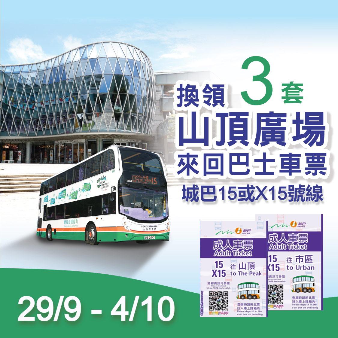 【三人同遊山頂廣場】新巴15 / X15路線巴士來回車票(3套)電子換領券 (9月29日至10月4日)