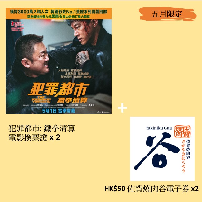 [2张“犯罪都市:铁拳清算”电影换票证及2张HK$50佐贺烧肉谷电子券]电子换领券