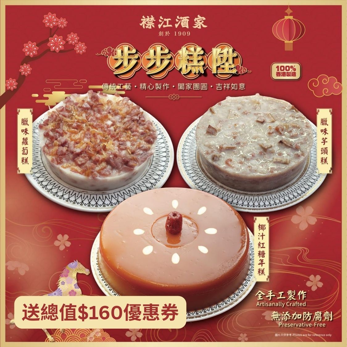 憑此電子券到襟江酒家家樂坊店可以優惠價HK$288換購襟江賀年糕點至尊套裝附送總值$160優惠券(價值︰HK$374)。 襟江賀年糕點至尊套裝: 年糕+蘿蔔糕+芋頭糕 換購日期: 2026年2月11日至2月14日 (年廿四至年廿七);逾期作廢。 換購時間:早上10時至晚上9時 換購地址:襟江酒家-旺角登打士街56號家樂坊8樓801號舖 查詢電話︰2396 3988 / 6890 0088 (WhatsApp) - 為確保足夠存貨,敬請於提前致電店舖查詢。 - 逾期作廢,恕不補發、延長或退款。 - 每張電子優惠券只可使用一次。不可兌換現金或其他貨品。 - 附送之總值$160優惠券的使用須受條款及細則約束,詳情請參閱優惠券背面。 電子券有效期: 2026年02月14日