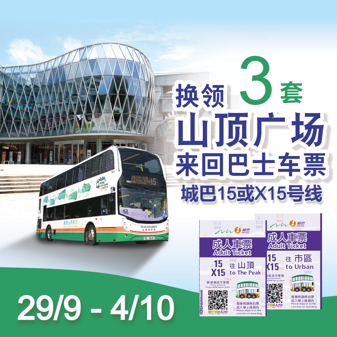 【三人同游山顶广场】新巴15 / X15路线巴士来回车票(3套)电子换领券 (9月29日至10月4日)