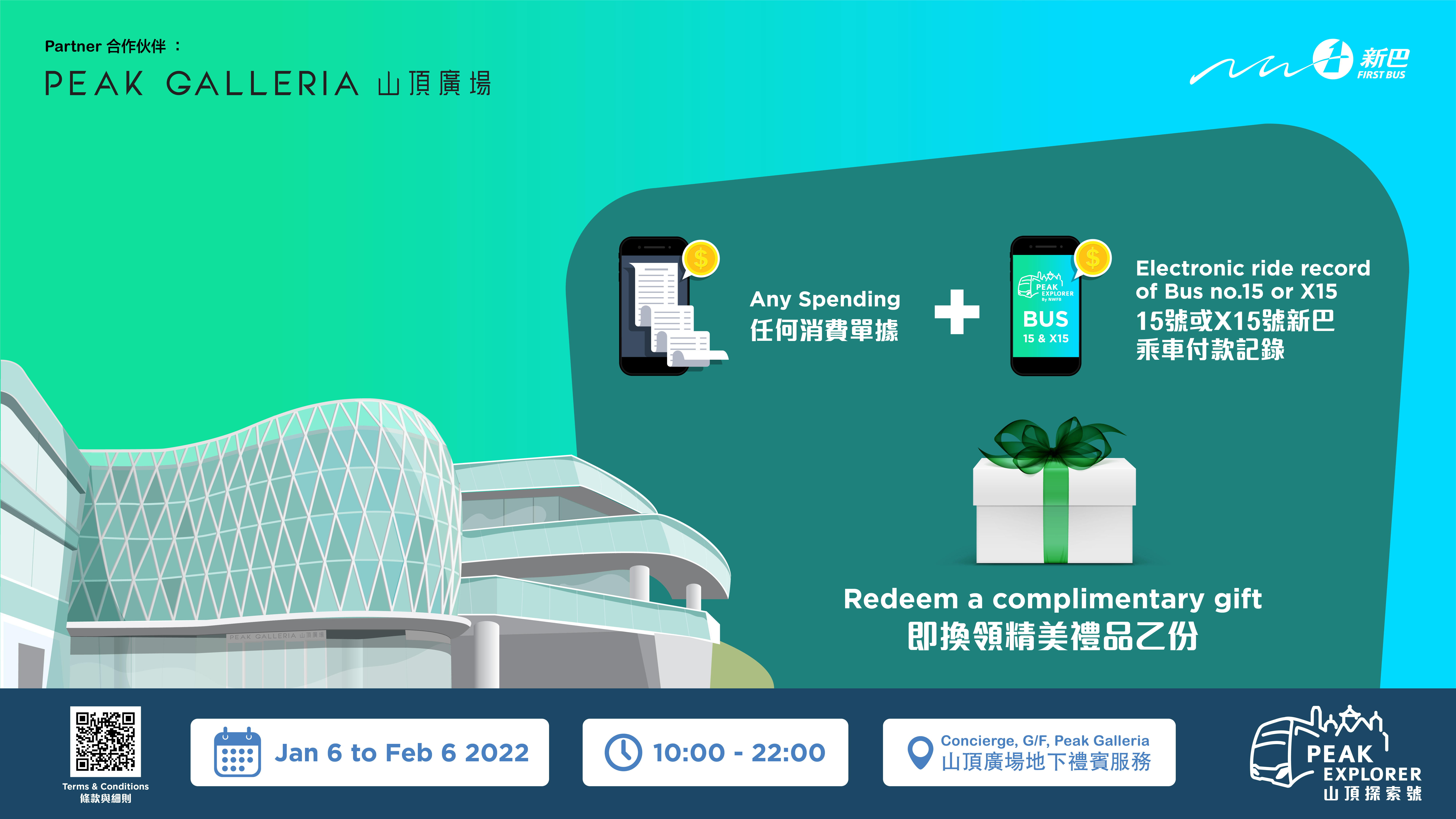 齐齐坐15/ X15号巴士上山顶新年行过大运! 凡于山顶广场任何消费及展示 15/ X15号巴士乘车付款记录即可免费换领精美礼品乙份!* 推广日期及时间: 即日至2月6日,10:00 – 22:00 换领地点: 山顶广场地下礼宾服务柜台 *数量有限,送完即止。条款及细则约束。