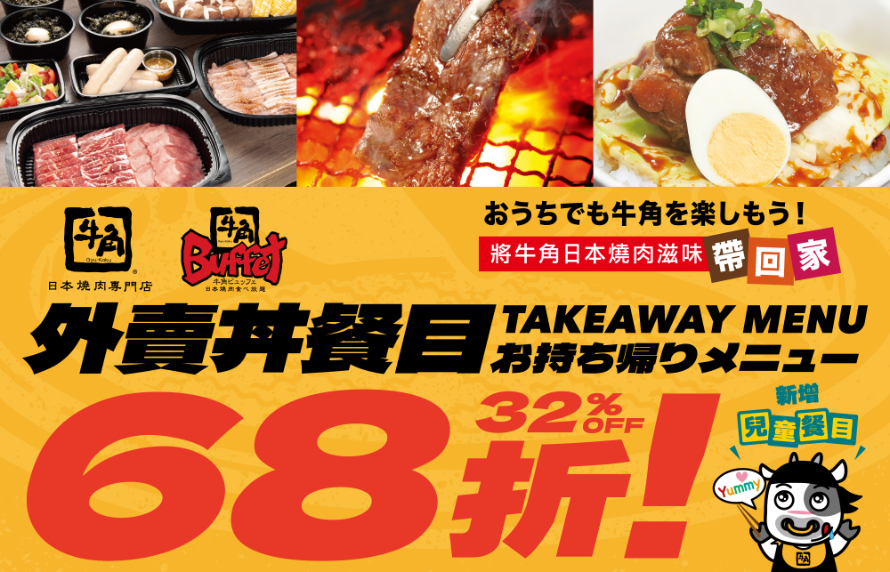 牛角: 外卖自取低至68折优惠 即日起至另行通知,顾客于牛角外卖自取指定餐牌即享低至68折优惠! 快来享受人气外卖丼套餐及精选烧肉套餐! (最后下单时间: 晚上8时) 外卖餐目详情: 【牛角】人气丼套餐: https://bit.ly/33AzO9U 【牛角】精选烧肉套餐: https://bit.ly/3f0ZmPS 【牛角】单点烧肉项目: https://bit.ly/32ZHS3L 【牛角Buffet】精选烧肉套餐: https://bit.ly/3HETgkk 于门店或网上下单: https://bit.ly/3JNU9ZS 数量有限,售完即止。条款及细则约束。