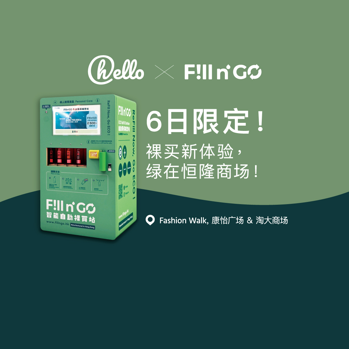 由6月24日起,一连六个星期「绿」约定你! 全港首个「24/7 智能裸买站^」于6月24日正式登陆Fashion Walk, 康怡广场及淘大商场! hello 会员只需于活动当日符合指定换领资格,即可获赠Fill n’Go环保智能铝樽一个及免费体验自助「裸买」指定天然洁手液 300g一次!今个6月及7月一齐支持环保新概念,走塑裸买新体验! 活动详情: 日期:24/6、1/7、8/7、15/7、22/7及29/7 (星期六) 时间:2pm-6pm 换领地点: - Fashion Walk1楼扶手梯旁 - 康怡商场北座地下 - 淘大商场2期1楼中庭 换领方法: 【新会员】 即场下载恒隆商场手机应用程式,输入推广码「Green」,登记成爲新会员,并即时透过会员帐户登记活动当日于场内单一电子消费满HK$100之交易,并于指定时间亲身到达指定换领地点向活动工作人员出示相关页面作核对。 【现有会员】 即时透过会员帐户登记活动当日于场内单一电子消费满HK$300之交易 ,并于指定时间亲身到达指定换领地点附近向活动工作人员出示相关页面作核对。 智能裸买站 - 免费自助体验地点: - Fashion Walk1楼扶手梯旁 - 康怡商场北座M楼 - 淘大商场1期地下G53-56号舖旁 ^智能裸买站营业时间将按照指定商场营业时间为准。如有任何更改,恕不另行通知。 名额有限,先到先得,换完即止。 活动受条款及细则约束。